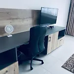 Sparrow Apartmens - Vrabcia Ulica 9, Kosice comprises a balcony and a seating area featuring a writing table, and modern comforts like a flat-screen TV with satellite channels. They are fitted with tile flooring. A bathroom has a bidet and a shower, as well as a hairdryer and towels.